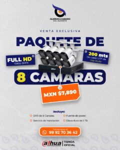 Paquete de 8 Cámaras Todo Incluido $7,950.00 8 Cámaras Bullet de policarbonato, DVR de 8 canales + 2ip, Disco Duro de 1 TB, 220 mts de Cable UTP Doble Forro